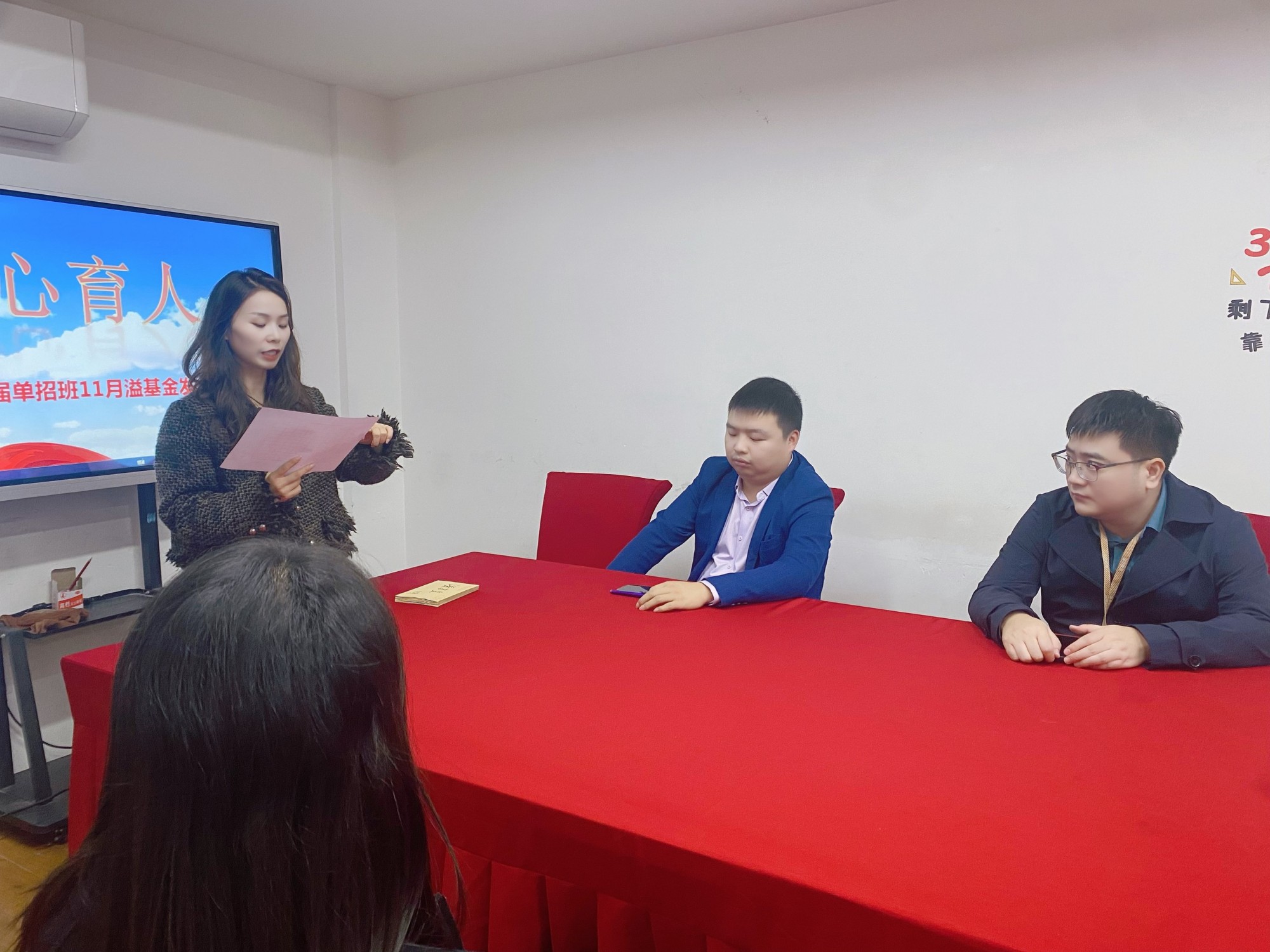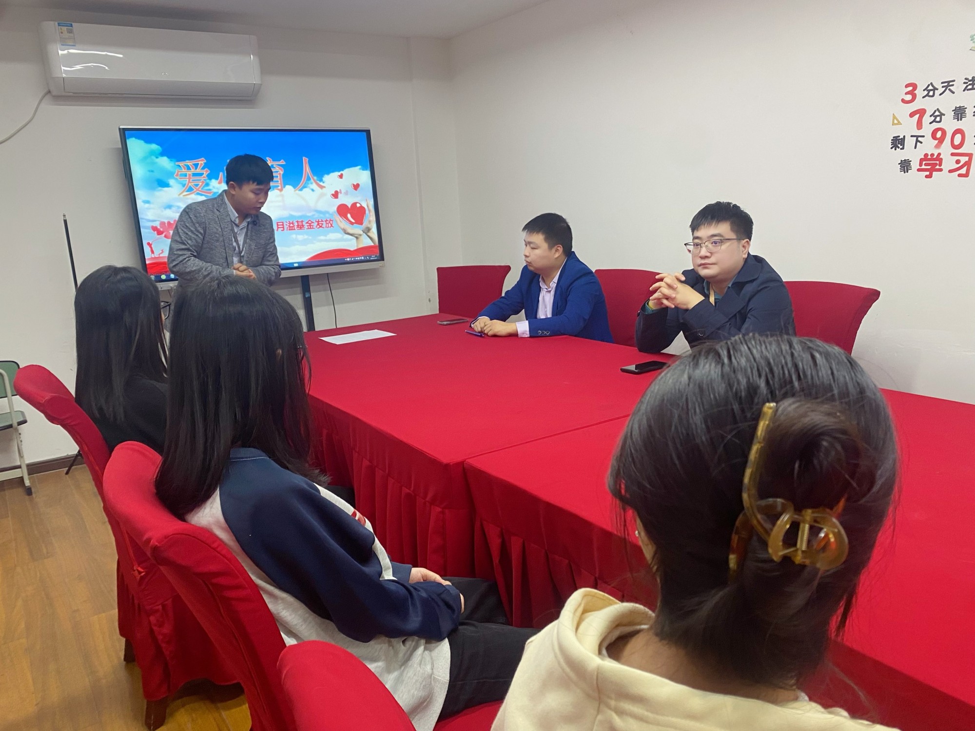 唐老师宣布了十月助学金获得者名单。随后,“扶贫资优”专项基金喻总为受助学生发放助学金,并合影留念。